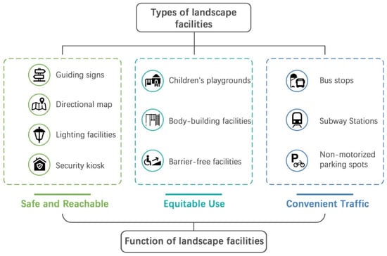 Although landscape facilities are a microscopic element in urban green space, they have a good role in promoting the shaping of the overall sense of urban public space, the grasp of spatial scale, and the interaction between people and the environment []. In addition, they play an important role in shaping the city’s image and improving its taste. Based on the three goals of providing users with safe and accessible places, fair use rights, and convenient transportation services. Xuhui Runway Park is also designed with landscape facilities, such as a guidance system, lighting system, security booths, barrier-free ramps, and traffic facilities (Figure 8).