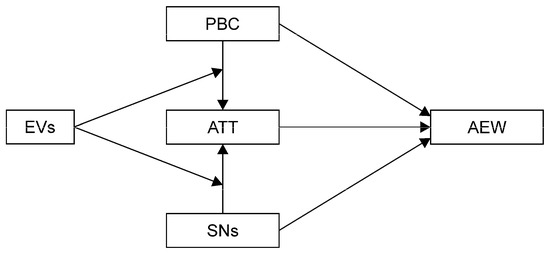 Ajzen’s TPB was developed based on the theory of reasoned action [41]. The TPB emphasizes that an individual’s specific behavior is determined by their behavioral intentions, which are affected by three variables: SNs, ATT, and PBC [42]. The TPB provides an excellent theoretical framework for explaining rational decisions and plays a dominant role in theoretical behavior research. The theory has also been extensively applied in studies that examine the behavior of farmers and their willingness to implement certain practices (e.g., farmers’ willingness to adopt agricultural technology [43,44,45], make decisions to diversify agricultural production [46], reduce their use of fertilizers and pesticides [47,48], and conserve water [49]. These studies have provided basic theoretical support for this study. Based on previous studies, EVs were further discussed, and their role in the effects of variables related to planned behavior on the AEW of farmers in the QMNP was analyzed and examined.