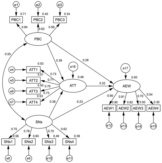 Table 7 and Figure 2 show the results of the path relationship test results using SEM, and the test results are assumed to support the corresponding research hypotheses: (1) The normalized path coefficient for the effects of PBC on AEW was 0.280, suggesting that the significance test was passed at the 1% level. A positive correlation was also evident between the test results, supporting the corresponding research hypothesis (i.e., H1). (2) The normalized path coefficient for the effects of SNs on AEW was 0.234, suggesting that the significance test was passed at the 1% level. A positive correlation was also evident between the test results, supporting the corresponding research hypothesis (i.e., H2). (3) The normalized path coefficient for the effects of ATT on AEW was 0.318, suggesting that the significance test was passed at the 1% level. A positive correlation was also evident between the test results, supporting the corresponding research hypothesis (i.e., H3).