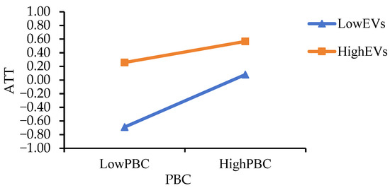 As shown in Table 9, the regression coefficient of the interaction term between farmers’ PBC and EVs was significant (, ), suggesting that EVs had a negative moderating effect on the relationship between farmers’ PBC and ATT. This finding supports the research hypothesis H5-1.