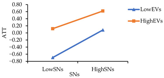EVs negatively moderate the mediating effect of SNs on AEW through ATT; that is, the higher the farmers’ EVs in the QMNP, the weaker the mediating effect of SNs on the farmers’ AEW through ATT.