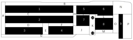 The model construction is divided into two components: building interior space and outdoor space. The building’s interior space is represented by a black color with corresponding node numbers as numbers, while the outdoor space is represented by a white color with corresponding node numbers (Figure 3). The delineation of the outdoor space is determined based on the criteria outlined in the convex space analysis. The convex space is distinguished by the property that every pair of points within the space has unobstructed visibility of one another [].