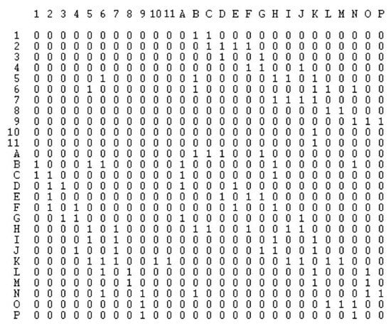 The spatial configuration of the industrial heritage park is represented as a network model, which captures the relationships between the various functional spaces within the park. Each functional space is treated as a node in the network, and the adjacent and accessible functional spaces are denoted as “1”, while the non-adjacent spaces are denoted as “0”. This information is then organized into a data matrix (Figure 4). The establishment of the current spatial network model of Sanlinqiao Industrial Heritage Park was achieved through the utilization of network analysis software, Ucinet (version 6.759), and graphic software, Netdraw (version 2.161).