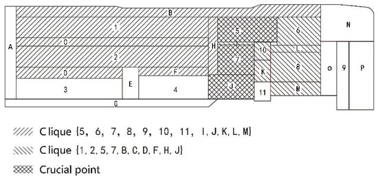 The average weighted clustering coefficient of the existing spatial network is 0.369, indicating a moderate level of local interconnectedness. However, the overall aggregation of the network is not particularly high. Eight factions can be identified through two-clique analysis (Figure 5). Faction 1 exhibits a low degree of overlap with other cliques, allowing for the simplification of the entire network into two factions: the east-side clique {5,6,7,8,10,11, I, J, K, L, M} (hereinafter referred to as the east-side clique) and {1, 2, 5, 7, B, C, D, F, H, J} (hereinafter referred to as the west-side clique) (Figure 6). The six nodes 4, 9, E, N, O, and P do not belong to any clique, while nodes 5, 7, and J serve as important connectors between the two cliques.
