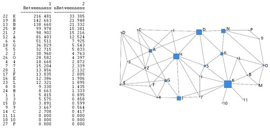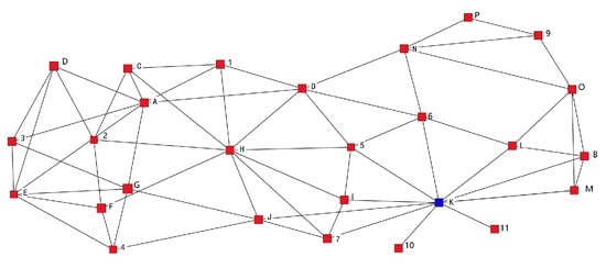 The network demonstrates a correlation coefficient of 0.432, suggesting a significant level of correlation within the network as a whole. After performing calculations, it has been ascertained that a critical point, referred to as K, exists within the spatial network. If node K is eliminated, nodes 10 and 11 will become disconnected from the remaining network (Figure 8). The removal of this element has a significant impact on the vulnerability and independence of nodes 10 and 11, rendering them the most susceptible entities within the entire network. On the contrary, nodes B, H, A, 2, K, and J within the network demonstrate a notable level of connectivity with other nodes, suggesting a robust degree of association and extensive reachability. Meanwhile, the connectivity of the nodes in the outdoor space is significantly higher in comparison to the nodes in the building space. However, nodes 9 and P demonstrate reduced levels of connectivity and are somewhat isolated from the broader network.