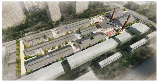 Industrial buildings possess open internal spaces, regular floor plans, and a high degree of adaptability for renovation and utilization []. During the transformation process, the design should focus on expressing, exploring, and revitalizing the potential of the space [].