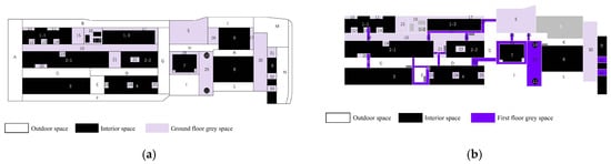 Spatial division of the renovated Sanlinqiao. (a) First-floor plan space division. (b) Second-floor plan space division.