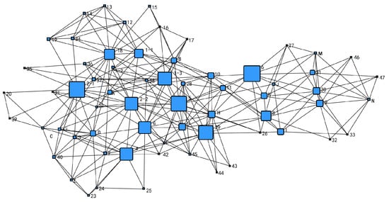 The central spatial nodes in the park network are: K, H, B, N, J, A, 6, G, 5, and 2 (Figure 7). These nodes are located on the shortest path of other nodes, control the interaction of other nodes, occupy more favorable spatial positions, and people will frequently pass through them when traveling, which is important for the spatial layout. Relatively speaking, nodes 11, 10, and P are less centrally located.