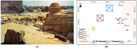 Groundwater level close to study area: (a) partial deterioration in low part of Sphinx body due to near-subsurface groundwater [39]; (b) groundwater elevation values in area of Great Pyramids with particular focus on area of the Sphinx (based on [38]).