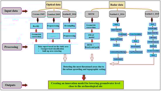 Remotely sensed land and groundwater indicators are more capable of providing useful data and information than traditional techniques. Thus, integrated remote sensing and GIS applications are widely utilized in groundwater mapping and have become the main focus of numerous geo-archaeological research, beginning with aerial pictures [40]. Therefore, this paper aims to assess the current status of the Giza heritage area based on the integration between remote sensing and GIS techniques. In addition, the study focuses on identifying and mapping the areas that are influenced by uncontrolled urban expansion and land use change, along with land subsidence. To achieve the study goals and quantify urban sprawl over the years, historical multi-temporal satellite data made up of Corona and Landsat have been investigated along with the new acquisitions provided by Orbview (GeoEye), Sentinel-1, and Sentinel-2 data. Results provided quantitative information on changes in the uncontrolled urban expansion that occurred around Egyptian monumental sites. On the other hand, the changes in the topography of the study area (land subsidence) were calculated based on the radar Sentinel-1 and SRTM data to show the effects of land use change on the paleo-landscape setting. Finally, based on this remote sensing and GIS-based analysis of multi-temporal and multi-sensor data analysis, a mitigation strategy is proposed for supporting the preservation of the archaeological area.