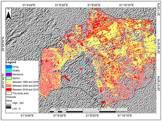 Cultural heritage sites are considered a wealth of human civilization beyond their value and are rare and irreplaceable places that show the lifestyles of ancient people [1,2]. UNESCO defined cultural heritage sites as “the result of life and inspiration, which should be protected and preserved” [3]. Cultural heritage regions, encompassing the archaeological and historical built environment and movable heritage, are at risk and still suffer from a lack of specific and systematic risk [4,5,6,7,8,9]. In 2005, a study prepared by ICOMOS considered the threats to 641 cultural and mixed world heritage properties due to development projects in addition to the lack of quantitative data on trends between 1994 and 2004 [10]. Indeed, the risks that threaten heritage sites include natural (e.g., fires, earthquakes, flooding, tsunami, land and mudslides, winds, tropical storms, land subsidence, etc.) and human factors (e.g., urban development, land drainage, agricultural sprawling, etc.) [11,12]. Egypt has multiple cultural sites, objects, and artifacts, as well as historic rock art sites [13]. For instance, the pyramid fields from Giza to the Dahshur were accepted as one of the World Heritage Sites in October 1979 [14]. Unfortunately, thousands of known and unknown archaeological sites in Egypt are at risk of destruction from urban sprawl and expanding development [15]. Specifically, uncontrolled and unplanned urban growth threatens cultural and ecological heritage and are among the major causes of archaeological site loss and damage [16]. Urban sprawl is generally regarded as one of the major problems accompanying contemporary urbanization in less-developed countries [17]. Around the world, the impacts of urban sprawl include the loss of community and environmental assets, such as cultural heritage sites [18,19], as a result of difficult ground and geo-environmental conditions [20,21,22].