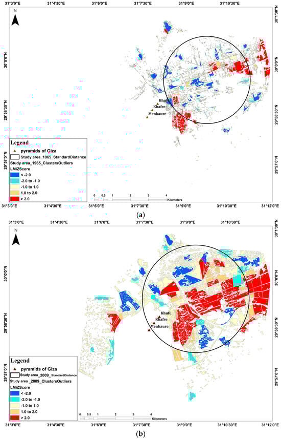 For the cluster outliers, it can be observed that the urban masses in the years 1965–2009 exhibit random distributions, as well as dispersion and divergence. The areas with a Z score less than 1, especially those ranging between (1: −1), whether in the western, northern, or southern regions, are shown in Figure 5a,b. The distances between urban masses converge and cluster in the center of the area in small spaces, while the remaining urban masses spread over a large area on the outskirts of the region. In contrast, in 2016 and 2019 (Figure 5c,d), an increase in the areas with a Z score greater than one, especially those with a Z score exceeding two, was observed. This indicates that the dominant urban pattern is clustering and convergence, especially in the eastern and western regions of the study area. This is due to the increase in the urban mass area in the study area.