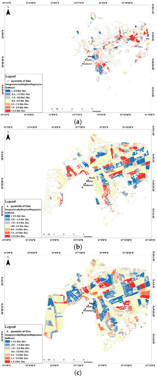 Overall, the results show that urban expansion greatly influenced the study area, particularly in 2019. Urban masses increased and clustered in the region, which was proven by different indices, such as geographically weighted regression, the Multidistance spatial cluster (K function), and Moran’s index. The study revealed that newly developed urban communities led to an increase in the spaces between urban masses along the region’s outskirts in 2019. This new development in the region resulted in urban explosions becoming more clustered and condensed in 2019 compared to previous years. This unmanaged urban expansion resulted in increased water leakage to groundwater in neighboring areas. The great pyramids of Giza have been threatened by this rise in groundwater level resulting from water infiltration from nearby urban masses. Two main aquifers are located near the Sphinx, with water levels of 1.5–4 m and 4–7 m below the surface [34]. These aquifers are recharged by water leakage from urban areas, leading to severe hazards in the area. Pyramid construction materials and structures might be damaged as a result of this water infiltration.