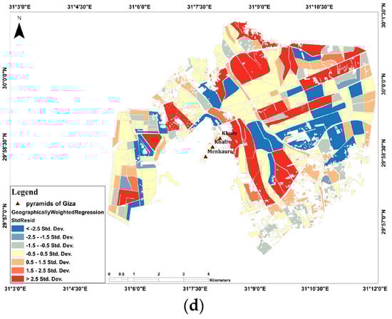 Based on Figure 6, the weighted geographic regression analysis indicated that the study area exhibited spatial heterogeneity during the period from 1965 to 2019. The red areas on the map indicate higher rates of urban expansion compared to the four forms (a, b, c, and d). These areas extended significantly in the inner parts of the study area during 1965, 2009, and 2016, and spread to the northern and southern parts in 2019. On the other hand, the blue areas on the map represent regions that experienced more urban growth than expected. Despite not being expected to occur, urban clusters spread significantly on the margins of the northern, eastern, southern, and western parts of the study area during the entire study period.