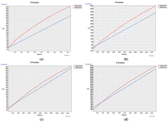 The mathematical transformation of Ripley’s K-function performed in ArcGIS is slightly different, and as a final result, the expected index of a random pattern is equal to the input distance [64]. To assess the pattern type, the observed L(d) value must be compared with the expected value. In each distance increment, the actual distribution is compared against a random distribution, and if the observed L(d) value is greater than expected, a clustered pattern is dominant at that scale of analysis. In turn, if this value is smaller than expected, the distribution is considered to be dispersed. Moreover, for the index of clustering or dispersion to be statistically significant, it must be greater or smaller, respectively, than the high or low level of the confidence interval [65]. In our study, Figure 7a indicates that there is a clustering and agglomeration of urban masses that are concentrated near distances of approximately 800 to 2000 m in which the red line (observed) deviates above the blue line (expected). This deviation reached a maximum distance between the two lines at 1400 m, where it reached 600 concerning L(d). Additionally, Figure 7b indicates that there is dispersion and divergence in the urban masses when the distance is less than 400 m, where the blue line deviates above the red line. This dispersion and divergence gradually decrease until there is a concentration of urban masses, especially at distances ranging between 1200 and 2400 m.