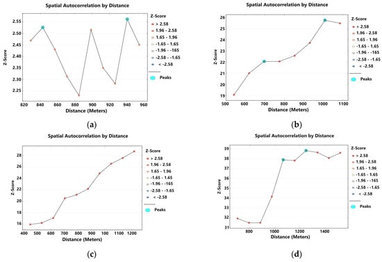 For 2016, the Global Moran’s Index Summary by Distance for the Spatial Autocorrelation statistic for the urban layer proved that the beginning distance was 445, the distance increment was 86.22, and the first peak (distance, value) and max peak (distance, value) were recorded as none. The results revealed that the Moran coefficient increased compared to that in the previous period, as did the z score. The z score ranged between 15.94 when the distance was 445 m and 28.70 when the distance was 1220.98 m (Table 5 and Figure 8c). This indicated that urbanization became closer and more clustered during this period in 2016 than during the previous period in 2009.