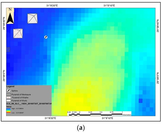 In this study, the two chosen dates were between 6 and 30 July 2016 and in the period between 30 July and 15 December 2016. The data showed that land subsidence occurred in this area, as illustrated in Figure 9a,b. The changes were mostly observed in the southern region near Nazlet El-Samman, which is close to the pyramids. On the other hand, the northern region experienced little change. The subsidence in the southern region reached about −0.0138 m over the period between 30 July and 15 December 2016. It is believed that groundwater may have caused the land subsidence, leading to the gradual sinking or settling of the land surface. When water seeps into the ground and saturates the soil layers, the soil can lose its structural integrity and contract. Consequently, structures such as the Great Pyramids and the Sphinx may have started sinking, which could eventually lead to structural damage.