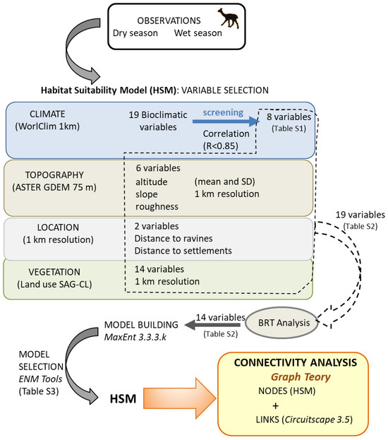 Graph theory was used to model the vicuña distribution landscape following the methodological procedure depicted in Figure 2. The procedure allowed simplification of landscape into nodes and links built on the observed habitat selection [35,36]. First, habitat suitability models for the species (HSMs) were built with MaxEnt at a 1 km grid scale based on climatic, topographic and vegetation explanatory variables and using our vicuña observations (see more details in Supplementary Materials). HSMs render a numeric value for each grid cell which represents how good it is for the species according to the value of habitat variables present in it, with relevant habitat variables and their loads extracted from the values observed in cells of known presences. Since models for the dry and wet seasons were equivalent, we further worked with one HSM built with vicuña observations irrespective of season. Following HSM building, the nodes or patches of interest for the species in the Tarapacá region were generated applying two cut-off suitability thresholds to the model, so that the core areas for the species (nodes) were defined as those surpassing in the habitat suitability model the value defined as the threshold. One of the thresholds selected was the value that maximizes sensitivity plus specificity (hereafter, MaxSS [37,38]). In short, MaxSS is the model output value for which the balance between the correct classification of actual presences and the erroneous detection of false absences within the training dataset is optimized on mathematical grounds. The second threshold, more conservative, was the average of model values for pixels with recorded vicuña presence (hereafter, AvPP; ref. [39]).