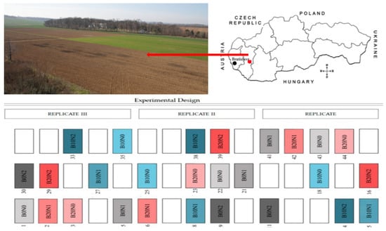 The field experiment took place at the Dolná Malanta Experimental Station of the Slovak University of Agriculture in Nitra, Slovakia (latitude 48°19′00″; longitude 18°09′00″). Situated east of Nitra, on the Žitavská upland, the experimental area is flat terrain with a slight southward incline. This location features a warm lowland climate, warm summers, and brief, dry winters. The long-term average air temperature and precipitation (1991–2020) were 10.7 °C and 559 mm, respectively. The geological substratum comprises earlier rocks rich in fine materials. Young Neogene deposits include diverse clays, loams, and sand gravels overlaid with loess in the Pleistocene epoch. The soil in the experimental field is classified as a Haplic Luvisol according to the World Reference Base for Soil Resources, based on the whole soil morphology profile [40]. The properties of the 0–20 cm soil layer before the experiment setup, on average, were as follows: clay—249 g kg−1, silt—599 g kg−1, sand—152 g kg−1, soil organic carbon—9.13 g kg−1, CEC—142 mmol kg−1, base saturation—85%, and soil pHKCl—5.71.