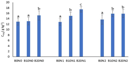 Observations over the six years revealed a significant increase in Corg in non-fertilised treatments, with the B20N0 treatment experiencing a significant increase of 2.46 g kg−1 compared to its control (B0N0). Corg shows an increasing trend with higher biochar application rates, as reported by numerous studies. The accumulation of Corg in soil is influenced by soil management practices and is generally a gradual process, primarily noticeable in the long term, albeit with variations across experimental sites [45]. About 90% of non-pyrolysed carbon entering tilled soil is typically released within a year [46]. However, given that biochar is a source of stabilised organic carbon [43], Corg contents will substantially increase following its addition; this effect is typically observable even after a single application treatment. We saw partial evidence of this process, with our results revealing that the B0N0 and B20N0 treatments significantly increased Corg by 80 and 222 mg kg−1 year−1 over the six years of vegetation seasons, respectively (Table 2). Interestingly, changes in Corg can also occur as a result of changes in soil pH, such as after applying alkaline biochar to an acidic soil. As reported Aydin [14] in a paper on the same experiment, the soil was acidic to start with, and after biochar application its pH significantly increased to neutral. The range of pH observed in this experiments, from slightly acidic to neutral, is likely suitable for most soil microorganisms [47], and SOM increases as a result of plant material deposition and microbial activity.