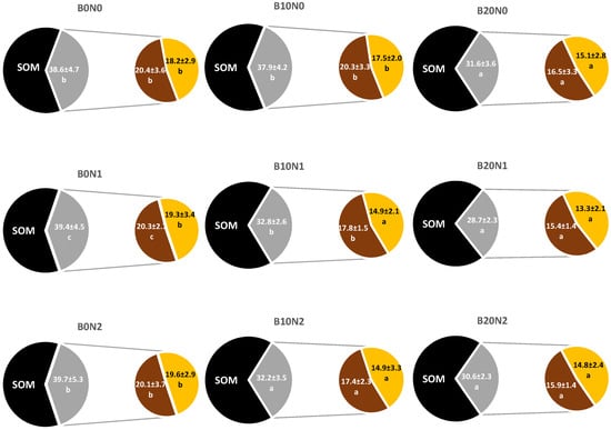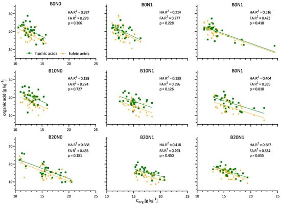 Combining a higher rate of biochar with both the first and second levels of nitrogen (B20N1 and B20N2, respectively) resulted in a significant decrease in the extraction of HSs, including HAs and FAs (Figure 3). Higher Corg contents corresponded to lower extraction of HSs, HAs, and FAs in SOM in biochar treatments combined with both levels of nitrogen fertilisation (Figure 4). The mineralisation of soil organic carbon can also be inhibited through the sorption of labile carbon onto the biochar surface, subsequently forming relatively stable organic substances [52]. Overall, the extraction of HAs in SOM across all nine treatments did not exceed 40% and ranged from 16.5 to 20.4%. A level of 40% indicates a very high degree of SOM humification, while the range of 10–20% suggests a low level of humification [53]. In our soils, even after applying biochar, organic matter primarily prevailed over humus, meaning that most of the SOM mineralised at the expense of humus formation. Even in unfertilised soil (control), it was constantly replenished through root exudates, plant and root residues, the biomass of microorganisms, etc. [39].