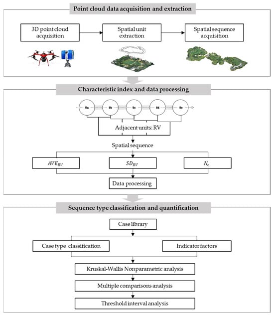 In this study, we intended to refer to the research method of quantitatively describing the change in spatial morphology. However, existing quantitative research has the following two limitations: ① Lack of indicator factors system that can describe the composite spatial variation characteristics of spatial sequences; ② Insufficient spatial data accuracy and low acquisition efficiency; ③ Limited number of cases (mostly single cases), and fail to attempt to validate the method in multiple cases. The variation of a single indicator cannot comprehensively describe the organizational characteristics of a sequence space. The change relationships of sequence spatial units are reflected at multiple levels, such as interface, enclosure, scale, density, and shape [20]. Additionally, it is difficult for traditional spatial information acquisition methods to precisely and accurately record the vegetation and external 3D spatial morphology shaped by vegetation. The height, crown width, and morphological characteristics of individual vegetation types as well as the overall canopy closure and canopy line of the vegetation community all impact the external form of a landscape space [21,22,23]. The lack of 3D morphological information and the limitations of data sources have led to low spatial data acquisition efficiency and insufficient quantitative analysis accuracy, which directly affect the comprehensiveness, accuracy, and credibility of quantitative studies on spatial forms.
