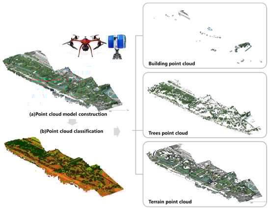 Both airborne light detection and ranging (LiDAR) scanning and unmanned aerial vehicle (UAV) oblique photography can achieve the rapid acquisition of medium- and large-scale landscape space information, such as information about urban parks and public green spaces [25,26,36]. Airborne LiDAR scanning equipment can directly obtain the space coordinate set of sampling points on the surface of a measured object through the execution of a flight task. The data acquired by the oblique camera of a UAV include image data and positioning and orientation system (POS) data. In the context capture modeling platform, the original data acquired by oblique photography can be generated through 3D aerial encryption, triangulation model construction, texture mapping, and other modeling steps to generate a 3D spatial reality model, which is ultimately output in the LASer (LAS) 3D point cloud format. The point clouds that record different types of space elements are classified in ENVI LiDAR. The point cloud set can be classified into a point cloud set that records information about the land surface, vegetation, and buildings (Figure 2).