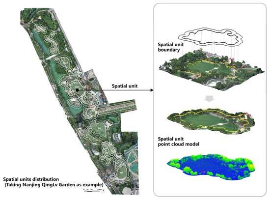 According to the above definition principles, the extraction of spatial units includes the following steps. First, in ArcMAP, through rasterization processing and an overlay analysis of the 3D point cloud model, the inner domain of the “virtual volume” space that can accommodate the activities is extracted. Next, the boundary range of the domain within the enclosed spatial unit is extracted through aggregation analysis. Finally, based on the unit area (400 m2 was used as the minimum unit area modulus in this paper) and path accessibility, spatial units that play an important role in sequence organization and construction are further screened (Figure 3).
