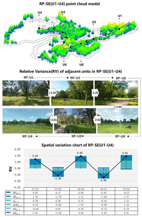 The spatial sequence RP-SE (U1–U4) in Rembrandt Park was chosen as an example (Figure 6). This case contains 6 spatial units, and the RVs of the adjacent units were 2.91→ −2.26 → 3.85 → −2.92 → 3.81. The of the RP-SE (U1–U4) was 2, the was 3.15, and the was 3.02. The sequence started with a positive change. Then, the direction of change was continuously reversed, and it ultimately ended with positive change. In addition, the space transformation resulted in multiple fluctuations. In the space experience of the Rembrandt Park sequence RP-SE (U1–U4), people’s emotions rise and fall with the reversal of the spatial changes among the paths.