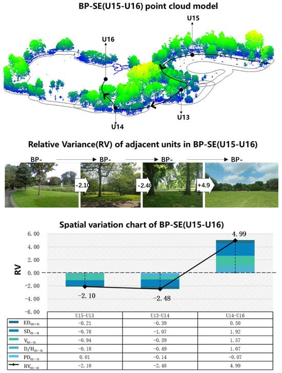 The study case BP-SE (U15–U16) located in Beatrix Park in Amsterdam was used as an example (Figure 7). The BP-SE (U15–U16) is composed of four spatial units, and the RVs of the adjacent units are −2.10→−2.48→4.99. The of the BP-SE (U15–U16) was only 1, the was 2.94, and the was 3.43. The front and middle segments of BP-SE (U15–U16) exhibited a consistent negative change trend, which reversed to a positive change trend at the end of the sequence, and the degree of positive change was extremely high. In terms of the experience, people’s emotions are continuously suppressed as the space shrinks, and then, with the appearance of the last space, they suddenly feel enlightened and uplifted.