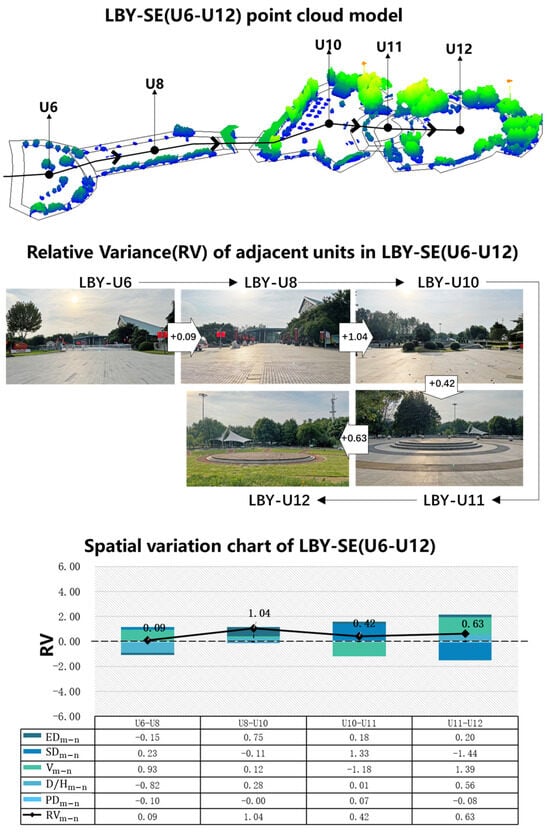 The study case LBY-SE (U6–U12) in Nanjing Expo Park was selected as an example (Figure 8). The spatial units that constitute the LBY-SE (U6–U12) are all hard paved squares. The sequence consists of five spatial units, and the RVs of the adjacent units were 0.09→1.04→0.42→0.63. The in the LBY-SE (U6–U12) was 0, the was 0.54, and the was 0.64. Although the RVs in the four change groups were all positive, the RVs were all low; that is, the overall development of the sequence did not significantly increase. Therefore, a moderate organization type can often bring the visitors a continuous and soothing experience.