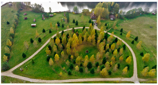 At the heart of the Sun Circle Park stands a magnificent altar, once adorned with a ceremonial bonfire, symbolizing the Sun. Encircling this central area are benches, with groups of trees arranged in seven rings, representing the orbits of planets around the Sun. Birch and spruce trees, chosen for their symbolic significance in Lithuanian folklore, adorn the park, representing masculinity and femininity, respectively. Their contrasting colours throughout the seasons create a striking pattern, emphasizing the Sun’s presence. Each ring corresponds to a planet’s orbit, with birch trees dominating the innermost ring, symbolizing Mercury, while campervan sites are located in Jupiter’s orbit. The layout of the park, including the ring road and parking lane, mirrors the orbits of Saturn and its satellites. The mature birch and spruce trees, arranged in curved patterns, resemble a grand mandala, adding to the park’s visual appeal and symbolic significance (see Figure 4). The evolution of Sun Circle Park’s landscape is not only observable from ground level, evidenced by the presence of the hang glider, but also from aerial images captured from orbit. While the trees continue to mature, additional infrastructure is being developed concurrently.