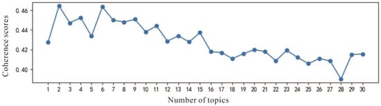 Python was employed for text analysis. Based on the result of coherence scores (Figure 2) and combined with empirical judgment, the identification of six topics yielded optimal results.