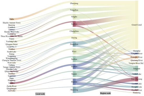 Finally, the classification of these four types of place names is not entirely mutually exclusive. For instance, West Lake belongs to the river systems of Hangzhou and also serves as a tourist attraction. Slender West Lake was originally a tourist attraction in Yangzhou but later recognized as a heritage site. However, these overlaps do not undermine the analysis results; instead, they illustrate the interconnectedness and integration of these spatial carriers. AHD tends to integrate spatial carriers at the local scale and construct a unique spatial organism for heritage tourism, exemplifying the process of localization in practice.