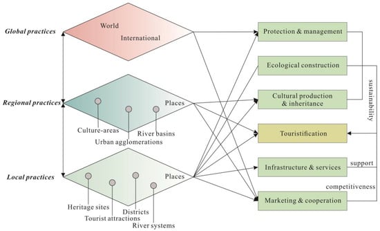 Thirdly, building upon the understanding of glocalization in heritage tourism [73], this paper discovers that AHD practices operate at multiple spatial scales—global, regional, and local. We capture the regional scale, which has received limited attention previously, aligning with and deepening Choay’s discourse on the spatial extension of heritage [23]. This expands the understanding of the scale of AHD practices and enhances the comprehension of the spatial scale involved in heritage tourism. Furthermore, we also revealed the correspondence between spatial and thematic practices, showing that different scales of spatial practices correspond to diverse thematic practices, deepening the research depth into the “triple extension” of heritage. Additionally, it offers promising possibilities for the profound interdisciplinary integration of heritage tourism and geography.