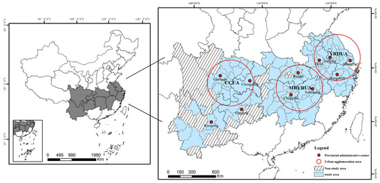 The YREB is the world’s largest inland river basin economic belt open for development, accounting for over 40% of the country’s population and GDP. The YREB comprises three major metropolitan areas: the Yangtze River Delta (YRD), the Middle Reaches of the Yangtze River (MRYR), and the Chengdu–Chongqing (CC) urban agglomerations (Figure 1). Despite its significance, the YREB still faces challenges such as uncoordinated regional development, irrational urban land use structure, and regional factor mismatch, which seriously obstructs its green and sustainable development. The study of ULUP can provide essential scientific insights to optimise land resource utilisation and enhance urbanisation quality. To ensure representative findings, we selected 109 cities in the YREB as study areas, taking into account the extensive coverage of the YREB and the administrative district adjustments.