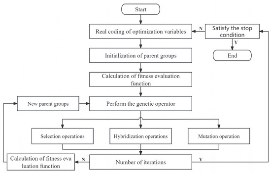 This is essentially a complex non-linear optimisation problem that is difficult to solve using conventional optimisation methods. Numerous well-established algorithms exist for solving nonlinear optimisation problems, some of which are inspired by natural phenomena, such as genetic algorithms [24], whale algorithms [25], and sparrow search algorithms [26]. In this paper, the Real coding-based Accelerating Genetic Algorithm (RAGA) is used for global optimisation using MATLAB 2019 software, resulting in the identification of the optimal projection direction vector. RAGA processes data in parallel, which allows it to cover a wide search range and increases the likelihood of finding the best solution. The RAGA loop can progressively refine and narrow down the optimisation range for the variable. As the number of loops increases, the solution’s accuracy is expected to gradually improve. The specific process of RAGA is as follows (Figure 2):