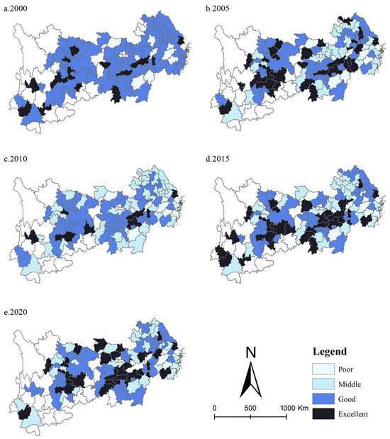 This paper applies the natural break point method to classify ULUP. The natural breakpoint method is based on clustering. It aims to maximise similarity within each group while maximizing dissimilarity between different groups. Unlike traditional clustering, this method minimises the differences in the number and range of features between each group, which will help us analyse the spatio-temporal variation of ULUP. The classification system has four levels: poor, average, good, and excellent. Table 5 displays the classification criteria. Figure 3 shows the spatial distribution of ULUP.