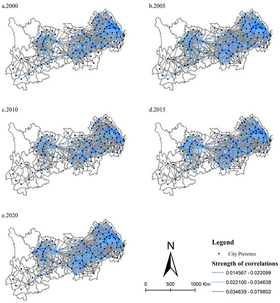 The degree of spatial association in ULUP is calculated using IGM. The spatial correlation paths and linkage strength of ULUP are drawn depending on the ArcGIS platform. In this paper, the natural breaking point method is used to classify the strength of ULUP. In addition, to achieve a better graphical effect, linkage pairs below 0.014 were deleted concerning related studies [39]. The results are shown in Figure 4. Overall, the spatial correlation intensity of ULUP has increased from 2000 to 2020. The average value rose from 0.008 to 0.01, suggesting an escalating interactivity among cities to improve ULUP.
