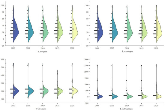 Between 2000 and 2020, there was an overall fluctuating upward trend in network efficiency. The most significant increase in network efficiency was between 2015 and 2020, from 0.7002 to 0.7096. It suggests that the cost of conduction and spillover of ULUP has decreased, and the correlation of ULUP among cities is more easily realized. All characteristics changed significantly between 2015 and 2020, possibly due to implementing the Yangtze River Economic Belt Development Program in 2016. This program promoted the proper and free movement of economic factors and the efficiency of resource allocation, thereby improving the ULUP.