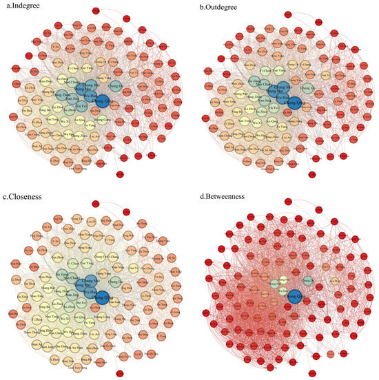 In directed graphs, degree centrality can be divided into indegree and outdegree, which respectively measure a node’s ability to receive and transmit relationships. The average degree centrality value in 2020 was 29.26, with 48 nodes having values higher than the average. Additionally, 58 nodes have an outdegree greater than their in-degree, indicating a network characterized by more spillover than benefit in ULUP.