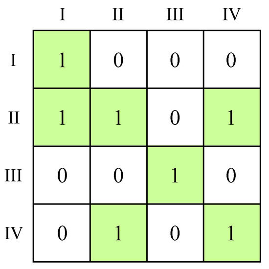 In addition, we calculated the density of the network between the four plates as follows, as shown in Figure 8. A value of 1 is assigned if the density of a plate is greater than the overall network density, indicating a spatial correlation between the row plate and column plate. Conversely, a value of 0 indicates the absence of spatial correlation between the row plate and column plate. Notably, all the main diagonal elements in this matrix are all assigned a value of 1, indicating that the correlation of ULUP exhibits a significant “club” effect. Specifically, Plate I and III have spillover effects exclusively within themselves. Plate II demonstrates spillover effects impacting all three other plates, while Plate IV influences both itself and Plate II.