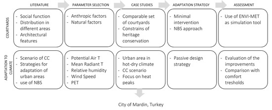 This study’s methodology encompasses several stages, as summarized in Figure 2. The study begins with a comprehensive literature review, followed by a description of on-site data collection. Following this, passive design strategies are developed for specifically chosen courtyards in the case study of Mardin, Turkey. These strategies are tailored to address the unique social functions, distributions, architectural features, and natural factors of the courtyards, considering the constraints of heritage conservation. The approach emphasizes minimal intervention, using Nature-based Solutions (NBS) and passive design to adapt urban areas to climate change scenarios, particularly focusing on heat peaks in hot, dry climates. The effectiveness of these strategies is then evaluated through simulations using the ENVI-met software (version 5.5), allowing for a detailed assessment of environmental improvements and a comparison with comfort thresholds. This multifaceted methodology aims to enhance the environmental performance and livability of urban spaces, particularly within the selected courtyards.