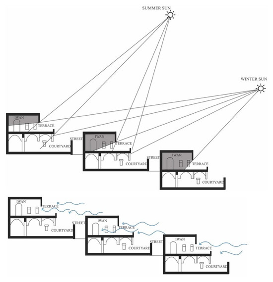 Relationship between daylight and shade under different sun positions (above), and wind flow scheme (below) in Mardin’s traditional houses [31].