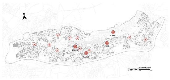 Locations of 14 examined courtyards (represented with lighter red) in Mardin old town, with the focus on 4 courtyards (represented with darker red) selected during the site visit conducted on 30 May 2023 by authors.