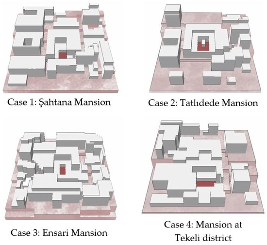 Despite its limitations, this study utilized ENVI-met to conduct thermal simulations and evaluate the microclimate regulation within Mardin’s courtyards. First, each case study was modelled through the software, taking into account the topography, as shown in Figure 8. The evaluation process prioritized the two hottest days in Mardin, specifically 14 August and 21 June. The former represents the hottest day recorded in recent years based on meteorological data, while the latter is the longest day of the year. Simulations were executed at noon when the sun was at its highest in the sky, ensuring maximum solar exposure.