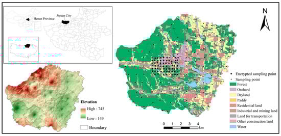 The Manghe River watershed is situated in the northern part of Jiyuan City, nestled within the southern foothills of the Taihang Mountains and adjacent to the bank of the Yellow River. Its geographical coordinate is 112°23′37″~112°33′2″ E, 35°3′4″~35°9′40″ N (Figure 1). The total area of the watershed is about 112.82 km2, with a population of about 150,000 people. The terrain is ‘horseshoe’ shaped, with a gradual slope from north-west to south-east, transitioning from mid-to-high mountains to hills, ridges and plains. The climate is warm temperate monsoon, with a stable average annual temperature of 14.5 °C and average annual rainfall of about 567 mm. The soils are mainly brunisolic soil and fluvo-aquic soils, with a pH of 6.07–8.16. Furthermore, this region experiences four distinct seasons along with ample sunlight exposure and abundant heat and water resources, providing unique favorable conditions for both industrial and agricultural development. After years of development, the industrialization level in the region has surpassed 70%, establishing itself as a leading smelting center for lead and zinc as well as a prominent silver production hub in China. The region contributes a quarter of China’s total lead production and 12% of its silver production, while also serving as a pivotal hub for steel, energy, chemicals and equipment manufacturing. However, as the first national demonstration zone for industrial and urban integration, the soil heavy metal pollution problem is particularly prominent.