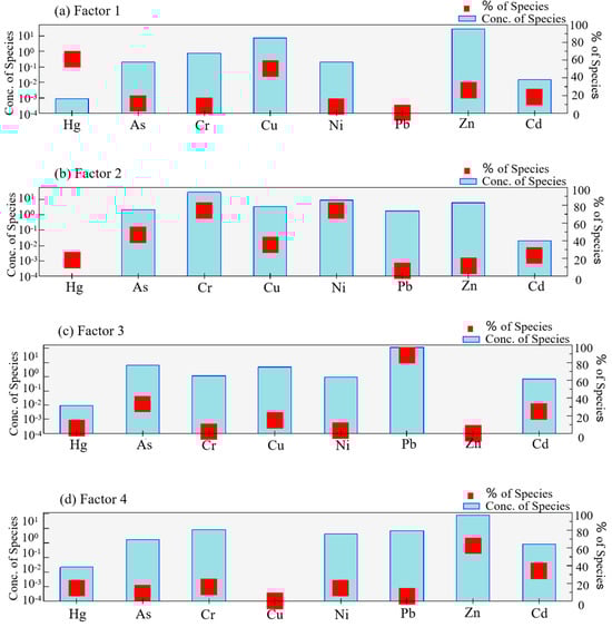 (4) Factor 4 contributed the most to Zn (62.3%) and Cd (34%). Correlation analysis showed a positive link between Zn and Cd (r = 0.452), suggesting a common source. Zn and Cd were commonly found in minerals as sulphides and disulphides, which were closely associated with mining activities [,]. Additionally, industrial processes such as electroplating, metal smelting, and the chemical industry were the main contributors to Cd pollution; however, under certain conditions, Cd can also enter the soil via fly ash generated from coal combustion or iron ore processing []. Therefore, it can be concluded that Factor 4 might be strongly associated with industrial activities.
