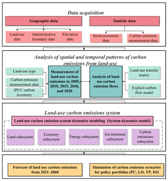 The research design of this study consists of four main steps (Figure 1). First is the allocation of carbon emission projects based on the four major carbon emission sectors identified by the IPCC carbon emission inventory and the major land use types identified in this study. Second, the geographic data and statistical data are used to measure the carbon emissions from land use in Nantong for five typical years. Third, the land use transfer matrix is combined with the explicit carbon flow model to analyze the direction of land use carbon flow during the four periods in the study area, and to reveal the spatial and temporal patterns of land use carbon emissions. Fourthly, an SD model of land use carbon emission is constructed, which includes five subsystems: land, economy, energy, environment, and carbon emission, to predict the net carbon emissions from land use in Nantong from 2005 to 2060, and simulate the carbon emissions under various policy combination scenarios.