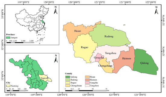 - Vector data: The vector data of the administrative boundary of Jiangsu Province and Nantong City were obtained from the Geographical information Monitoring Cloud by Platform (https://www.resdc.cn/, accessed on 17 April 2024).